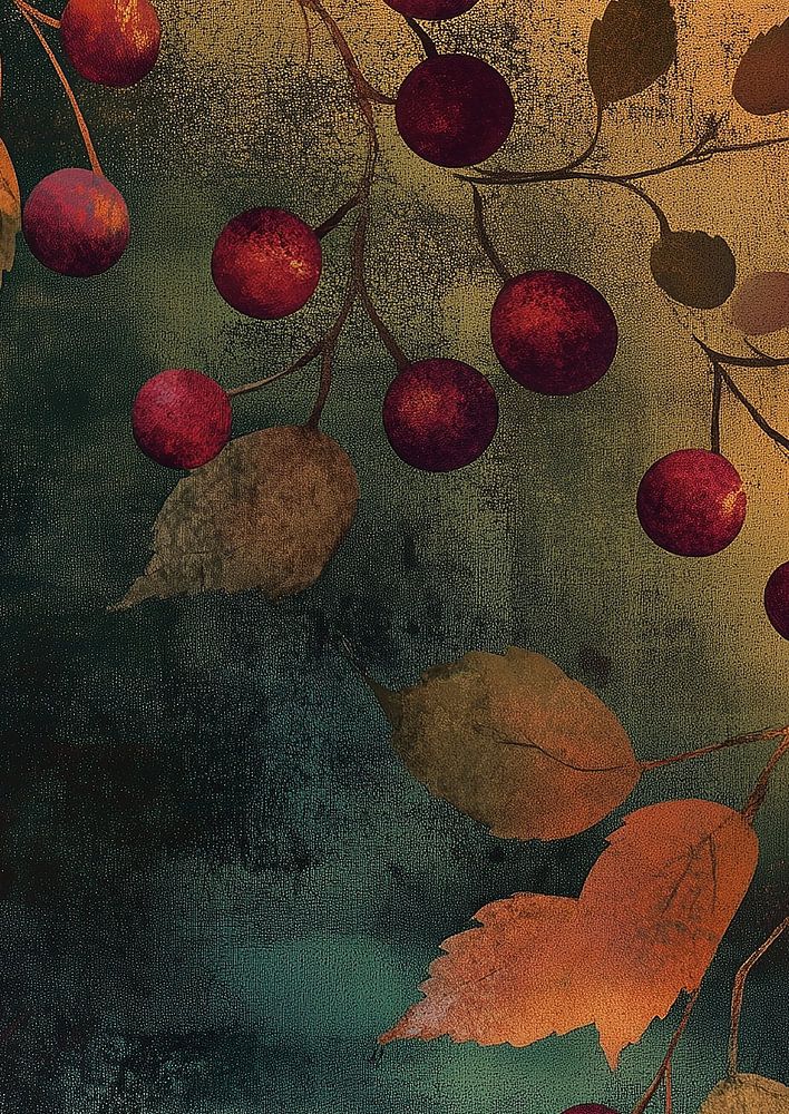 Auf einem üppigen smaragdgrünen Hintergrund funkeln mystische Beeren in tiefen Rottönen. Ihre samtige Haut fängt das Licht auf subtile Weise ein, während goldene Sprenkel zwischen den Beeren wie ein himmlisches Leuchten tanzen. Die smaragdgrüne Umgebung strahlt eine ruhige, göttliche Energie aus, so dass die Beeren in einem zeitlosen Raum zu schweben scheinen. Jede Beere scheint von Magie durchdrungen zu sein, als ob sie Geheimnisse aus einer anderen Welt birgt, während der Kontrast zwischen dem satten Violett, dem tiefen Smaragdgrün und den schimmernden Goldtönen eine märchenhafte Atmosphäre hervorruft.