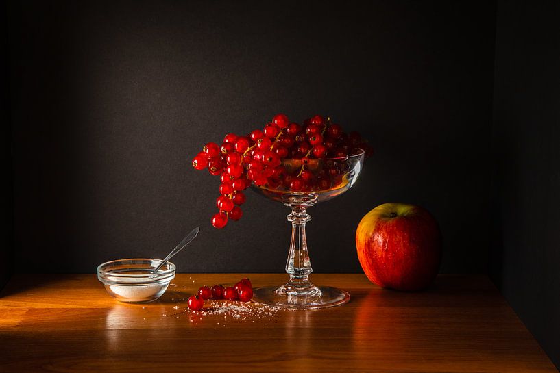 Ein Stillleben mit Früchten und Zucker. Rote Johannisbeeren in einem Coupe-Glas, flankiert von einer Schale mit Zucker und einem Apfel. Die Belichtung erfolgt von links nach innen.
