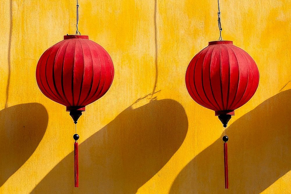 Leuchtend rote Laternen schweben sanft vor einem warmen, gelben Hintergrund und werfen einladende Schatten. Ihre verspielte Anordnung und lebendige Farbkontraste erwecken den Raum zum Leben. Ideal für ein Wohnzimmer, verleihen sie eine asiatische Note und schaffen eine Atmosphäre der Gemütlichkeit und Inspiration. Perfect for gesellige Abende oder kreative Gespräche.