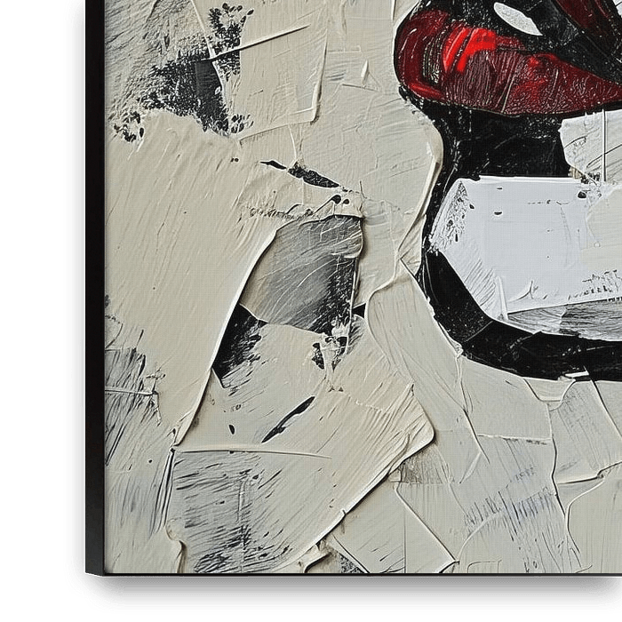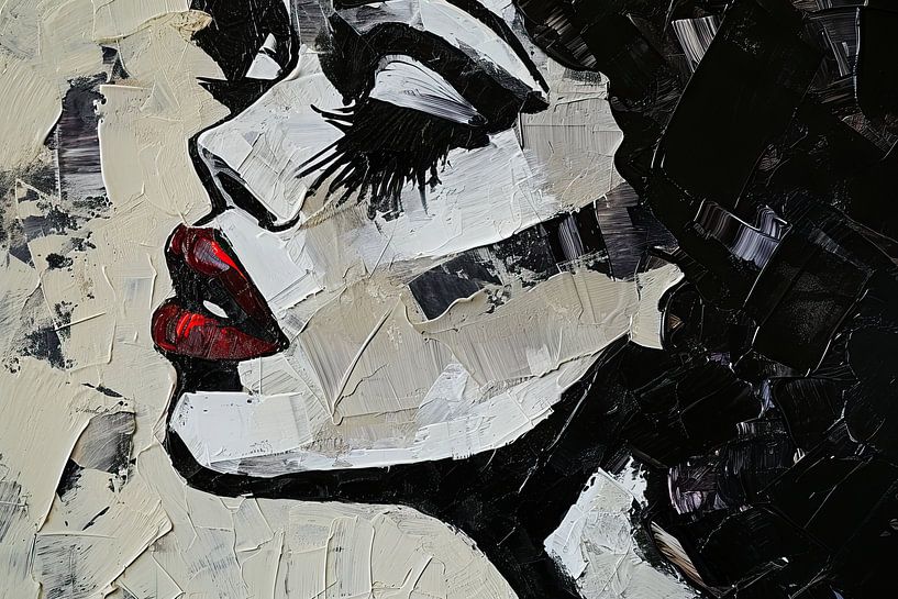 Rode Lippen | Rode Lip, Zwarte Wimpers - Dit schilderij pakt je meteen bij de mond en bij het oog — letterlijk: twee elementen overheersen en voeren het woord. De lippen, geschilderd met dikke, glanzende verf, trekken alle aandacht door hun dieprode glans en gelaagde toets. Ze zijn niet netjes omlijnd, maar opgebouwd uit meerdere lagen…
