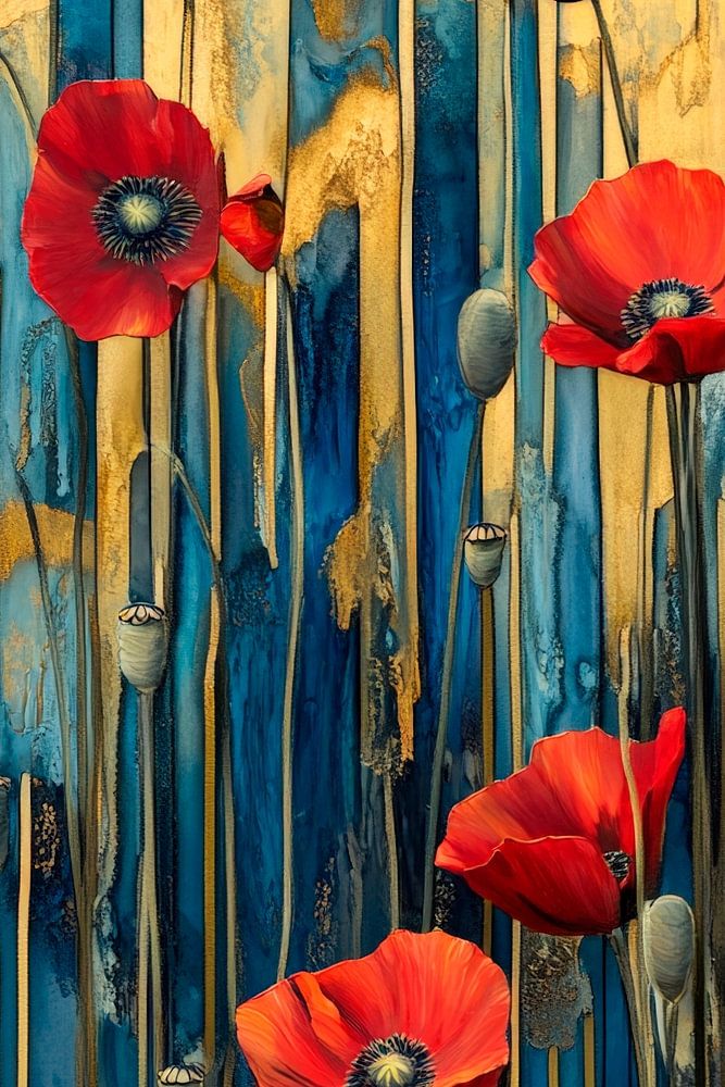 Mit lebhaften, roten Mohnblumen, die sich elegant vor einem goldenen und blauen Hintergrund entfalten, versprüht dieses Kunstwerk eine harmonische Farbkomposition. Die dynamischen Linien und die strahlenden Farben bringen Leben in jeden Raum und verleihen insbesondere dem Wohnzimmer eine einladende und zugleich kunstvolle Atmosphäre. Ideal für einen Blickfang!