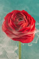 Red Ranunculus enveloped with a hint of smoke" ist ein Makrofoto einer roten Ranunkel vor einem türkis / petrolfarbenen Hintergrund. Um und in dieser Blume hängt ein Rauchschleier. Dieser subtile Rauch um die Blume verleiht ihr ein geheimnisvolles und aufregendes Element, das die leuchtend rote Farbe vor dem Hintergrund noch intensiver…