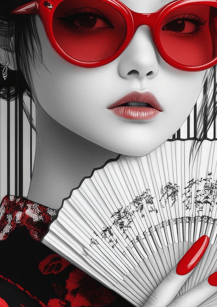 Die lebhafte rote Reflexion in ihrer Sonnenbrille deutet auf eine unsichtbare Welt hin und verleiht dieser atemberaubenden monochromen Illustration Tiefe.
