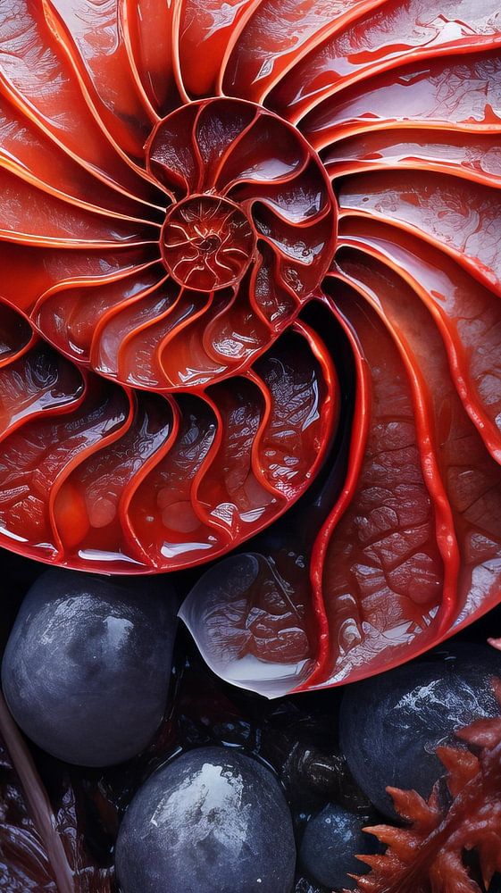 Nautilus-ähnlicher spiralförmiger Organismus, der auf einer felsigen Meeresoberfläche wächst. AI-Bilder, Naturfotografie, Schönheit in der Natur.