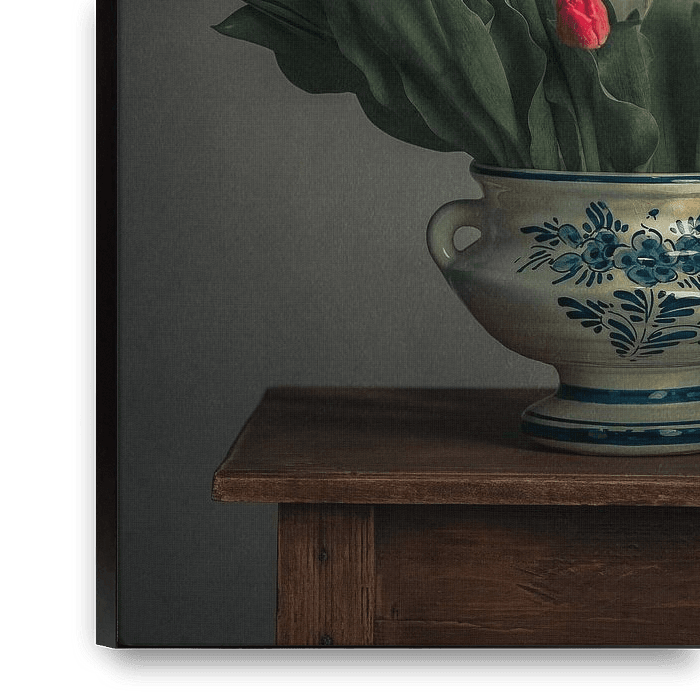 Bestelle dieses Stilleben Rote Tulpen in einer Delfter Blau Vase von Mariska Vereijken als Reproduktion auf Leinwand, Alu-Dibond, als Poster, Fototapete oder Acrylglasbild.