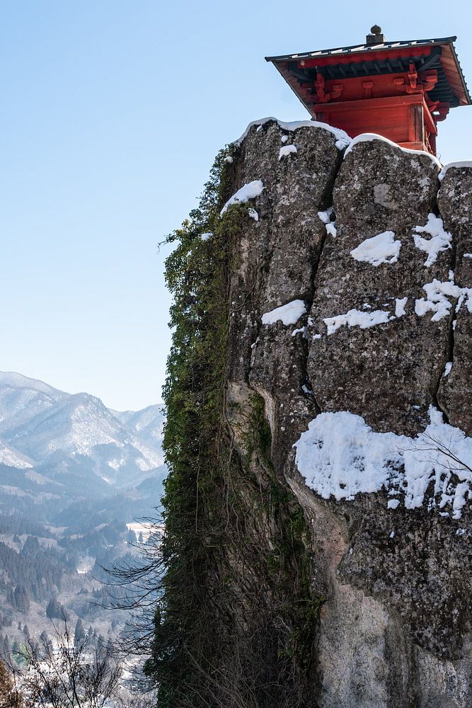Roter Tempel in Yamadera bei Sendai und Yamagate in Japan auf einem schneebedeckten Berggipfel an einem sonnigen Wintertag. Mit Blick auf die Berge in der Ferne.