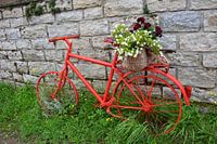 Niederlande, Fahrradland. Und wenn Sie mit dem Rad unterwegs sind, können Sie mit Ihrem alten Fahrrad immer noch eine Menge lustige Sachen machen. Wie rot zu malen und es als Übertopf und Dekoration zu verwenden.