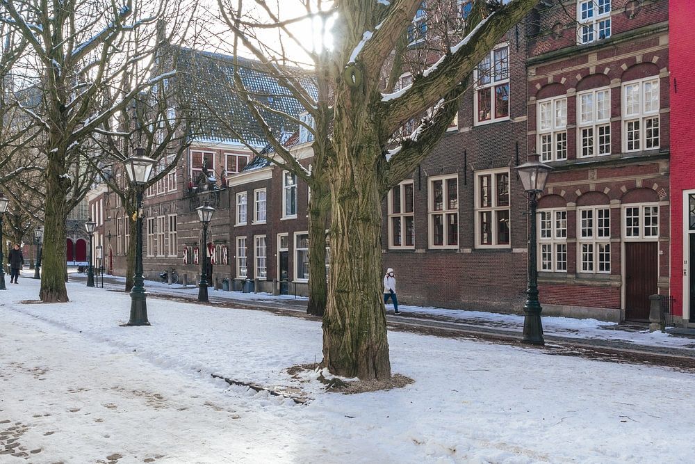 Die Hooglandse Kerkgracht in Leiden mit einer kleinen weißen Decke. Mit dem schönen roten Haus.