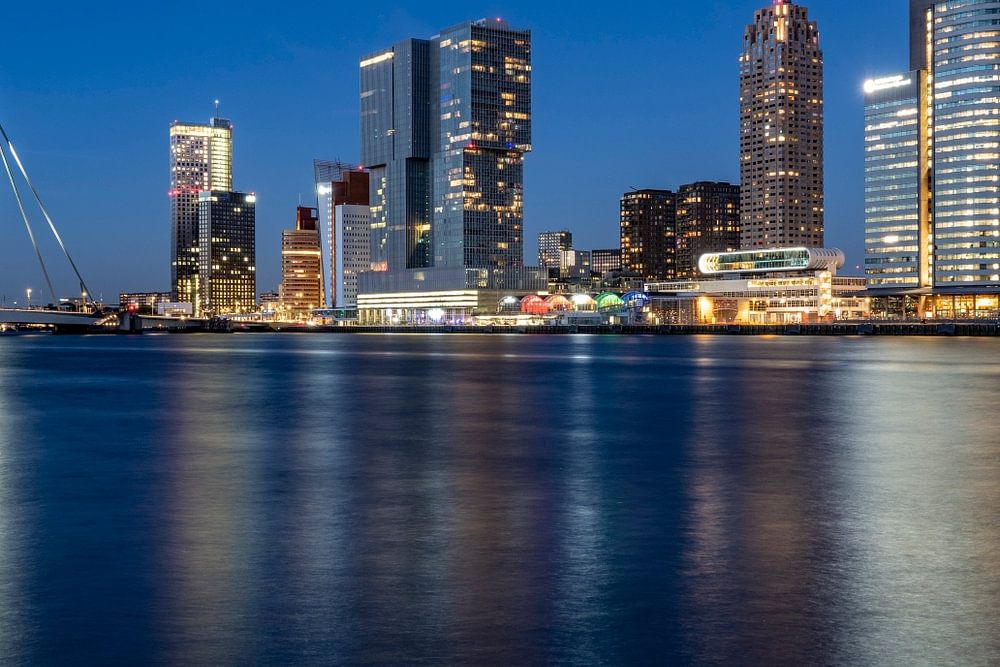 Rotterdam von der Westerkade in Richtung Kop van Zuid, Hotel New York und Erasmusbrücke. Blaue Stunde mit Spiegelungen der Hochhäuser auf dem Wasser.