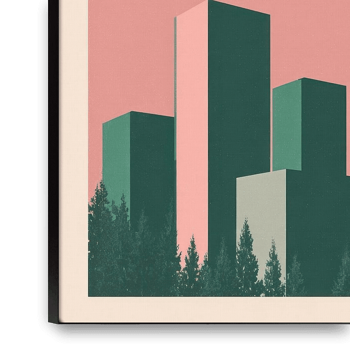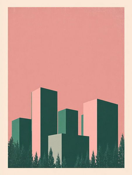 Die Skyline von Rotterdam reduziert auf einfache Blockformen. Das zarte Rosa kontrastiert mit dunkelgrünen Gebäuden und schafft eine ruhige, fast verträumte Atmosphäre. Eine minimalistische Stadtszene mit kräftigen Farbkombinationen.