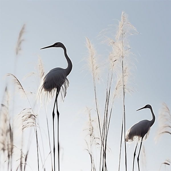 Zwei weiße Vögel stehen inmitten von hohem Gras in einem Stil, der an die Kunstfotografie der Shang-Dynastie erinnert. Die Kulisse ist eine Küstenlandschaft, die von hellen himmelblauen und dunkelgrauen Tönen geprägt ist. Das Foto strahlt einen raffinierten Minimalismus aus und hebt die charakteristischen Tiere in ihrem natürlichen Lebensraum hervor. Dieses Werk weist Elemente der dokumentarischen Reisefotografie auf.