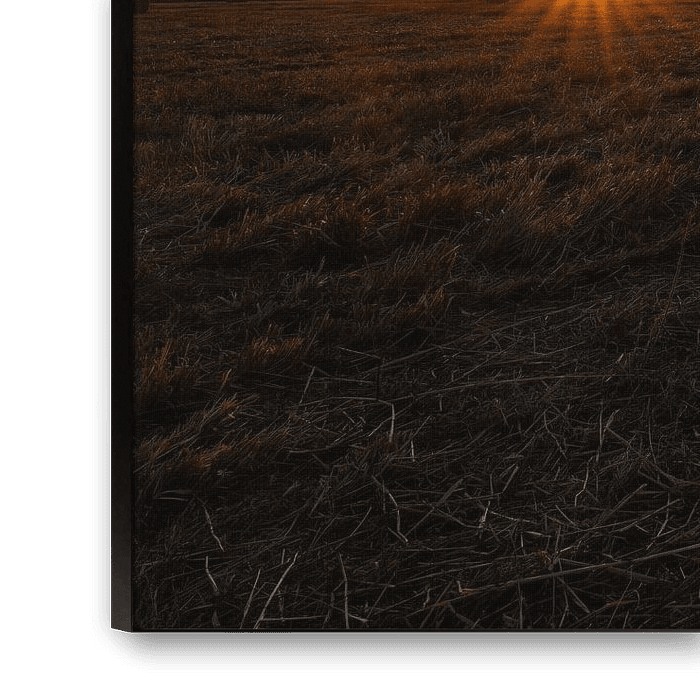 Eine weite, offene Landschaft kurz nach der Ernte. Ein großer Teil des Bildes wird vom weiten Himmel eingenommen, der von sanften Wolken und dem warmen Licht der sinkenden Sonne dominiert wird. Ein einzelner, markanter Strohballen steht im rechten Vordergrund und dient als Ankerpunkt für die weite Szenerie. Die Stoppeln des Feldes bilden eine feingliedrige, dunkelbraune Textur, die den Blick in die Ferne leitet, wo sich die Silhouette der Bäume gegen den farbenprächtigen Horizont abzeichnet. Die Inspiration lag in der Einfachheit und Erhabenheit des Landlebens. Ich wollte die unendliche Weite des Himmels und die friedliche Stille einfangen, die nach dem Abschluss der Ernte über dem Feld liegt. Die Atmosphäre ist ruhig, weitläufig und tiefgründig. Die Kombination aus dem kühleren Blau im oberen Himmel und dem intensiven Orange-Gelb am Horizont schafft einen harmonischen Farbklang und vermittelt ein Gefühl von Freiheit und Offenheit. Die Aufnahme ist eine klassische Landschaftsaufnahme, die den Fokus auf die Weite und das Gleichgewicht zwischen Erde und Himmel legt. Das Bild vermittelt ein Gefühl von Offenheit und kann kleine Räume optisch vergrößern. Die natürlichen, erdigen Farben passen zu vielen Einrichtungsstilen.