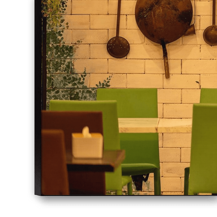 Im Vordergrund sind die Rückenlehnen einiger Stühle und Tische zu sehen, was auf einen Essplatz hindeutet. Die warme, gelbe Beleuchtung trägt zu der gemütlichen Atmosphäre bei.