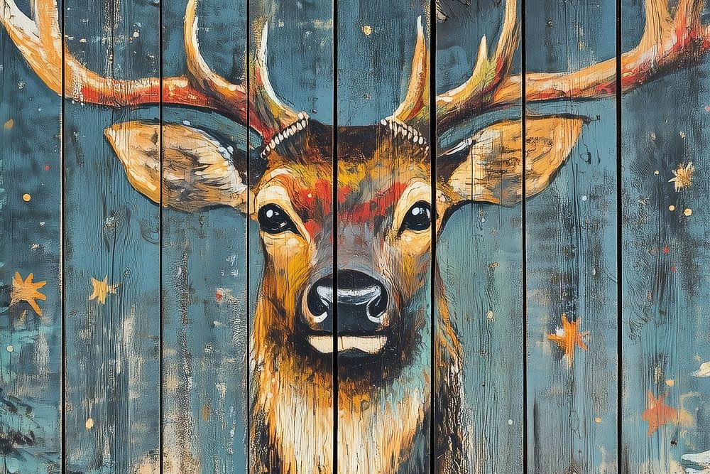 Dieses bezaubernde Wintermotiv zeigt einen majestätischen Hirsch, der auf verwitterte Holzplanken gemalt wurde und so einen einzigartigen rustikalen Charme ausstrahlt. Die blauen und türkisfarbenen Töne der Holzbretter bilden einen traumhaften Hintergrund, der an einen verschneiten Winterhimmel erinnert.