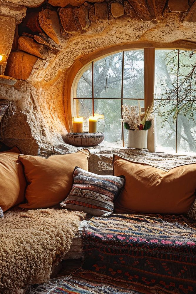 Entdecken Sie ein einzigartiges Wohnerlebnis in diesem gemütlichen Höhlenhaus, in dem der rustikale Charme von Naturstein mit warmen, einladenden Stoffen und satten Farben verschmilzt. Perfekt für alle, die sich von der Hektik des Alltags zurückziehen möchten. Dieser Raum bietet eine ruhige Oase mit bequemen Sitzgelegenheiten, umgeben von kunstvoll platzierten dekorativen Elementen und natürlichem Licht, das dem Raum ein offenes und luftiges Gefühl verleiht. Erleben Sie die perfekte Mischung aus natürlichen Materialien und weichen Textilien, die zusammen den ultimativen Ort der Ruhe und Inspiration schaffen.