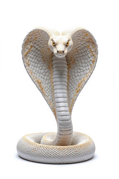 In vollkommener Symmetrie erhebt sich die Schlange im reinen Weiß, ihr Körper in einer makellosen Spirale gebunden, als wäre er aus stiller Präzision und Licht geformt. Die aufgerichtete Gestalt mit weit geöffnetem Nackenschild wirkt wie ein lebendiges Ornament, jede einzelne Schuppe fein modelliert und von zarten goldenen Akzenten…
