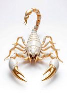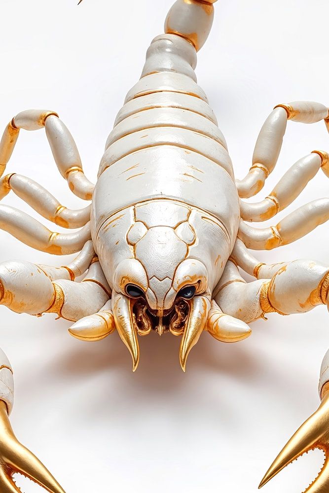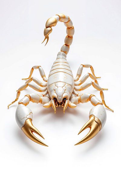 In gespannter Stille erhebt sich der Skorpion im reinen Weiß, als wäre er aus einer perfekten Verbindung von Materie und Licht erschaffen. Sein Körper wirkt wie eine präzise Skulptur, jede Segmentierung klar definiert und von subtilen goldenen Akzenten durchzogen. Die kraftvollen Scheren glänzen in edlem Gold, während der gebogene…