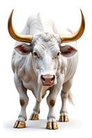 In gespannter Ruhe tritt der Stier aus der klaren Leere hervor, seine Präsenz von unmittelbarer Kraft und konzentrierter Energie geprägt. Sein Körper erscheint in edler, nahezu makelloser Weißheit, die jede Muskelstruktur weich modelliert und zugleich seine physische Dominanz betont. Die weit ausladenden Hörner leuchten in warmem Gold…