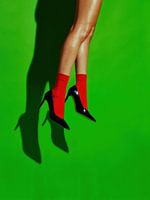 Ein Bild, das mit Schwerelosigkeit und Kontrolle spielt. Die Beine scheinen vor einem leuchtend grünen Hintergrund zu schweben, während die schwarzen Absätze und roten Socken einen scharfen grafischen Kontrast bilden. Die Haltung ist entspannt, aber präzise, als sei sich der Körper jeder Linie bewusst, die er bildet.