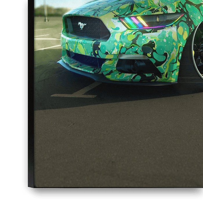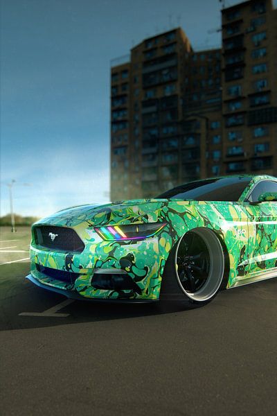 Dieser Ford Mustang GT bricht mit seiner atemberaubenden limettengrünen Marmorierung aus der Norm. Vor urbanem Hintergrund definieren die regenbogenfarbenen Scheinwerfer und die geduckte Haltung den modernen Streetstyle.