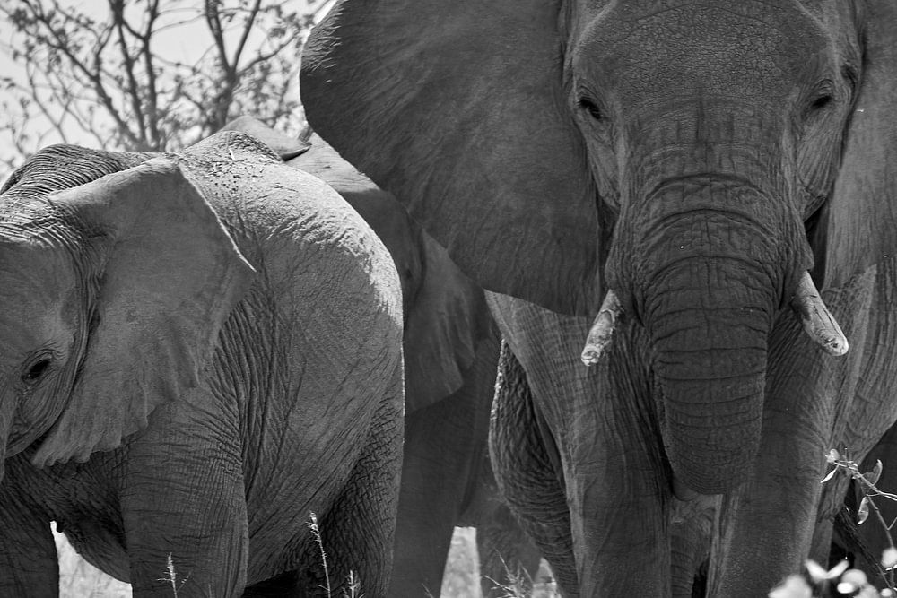 Eine Elefantenfamilie läuft duch die Savanne in Namibia, Afrika (schwarz-weiß)