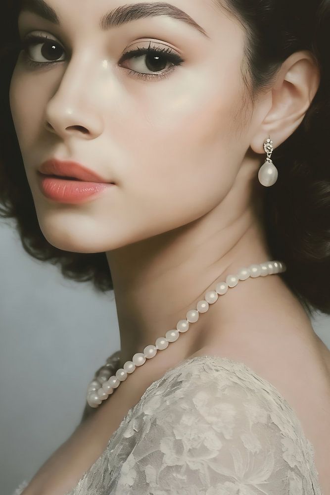 Diese Vintage-Arbeit zeigt ein schönes, verträumtes Porträt, das zeitlose Eleganz ausstrahlt. Sie sehen eine junge Frau mit wunderschönem dunklem, lockigem Haar, das perfekt zu einer klassischen Frisur gestylt ist, die die Vintage-Atmosphäre noch verstärkt. Sie trägt ein zartes Spitzenkleid mit tiefem Ausschnitt, eine raffinierte Perlenkette und passende Ohrringe sowie ein funkelndes Diadem, das ihren königlichen Look vervollständigt.