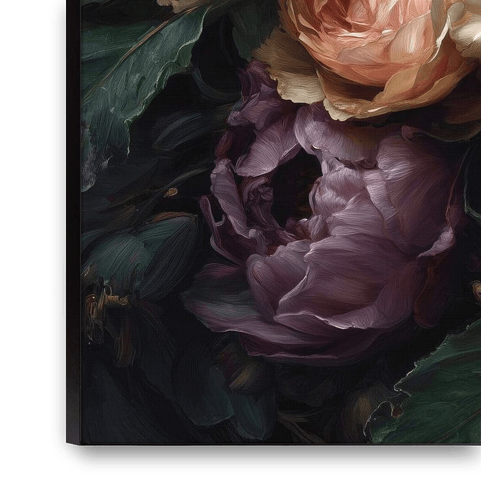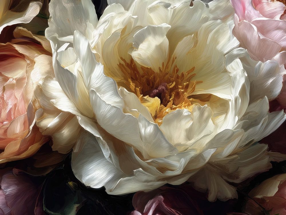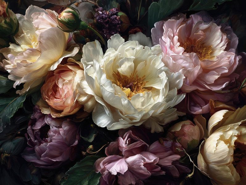 Eine detailreiche Blumenkomposition mit üppigen Pfingstrosen in zarten Elfenbein-, Rouge- und Mauvetönen, beleuchtet von einem malerischen, dramatischen Licht, das an klassische Stillleben und zeitlose Eleganz erinnert