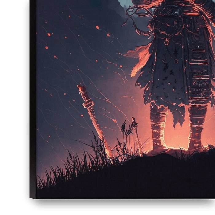 Kunstgemälde mit der Figur eines eleganten Samurai-Ritters, der mitten in der Nacht steht und sehr beängstigend dargestellt ist, vermittelt den Eindruck einer brennenden Leidenschaft