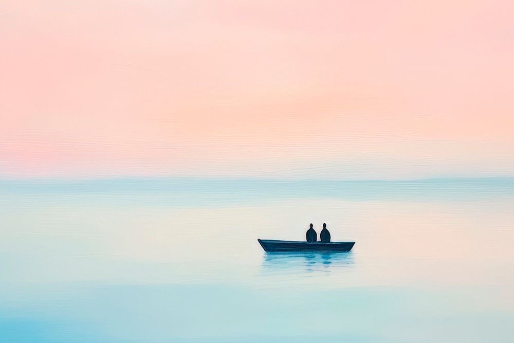 Sanfte Pastelltöne umhüllen eine ruhige Szenerie, in der ein kleines Boot auf dem glatten Wasser schwebt. Die harmonische Stille und das Gefühl der Unendlichkeit laden zur Reflexion ein. Dieser beruhigende Anblick harmoniert perfekt im Schlafzimmer oder Wohnzimmer, wo er eine Atmosphäre der Entspannung und des Friedens schafft.