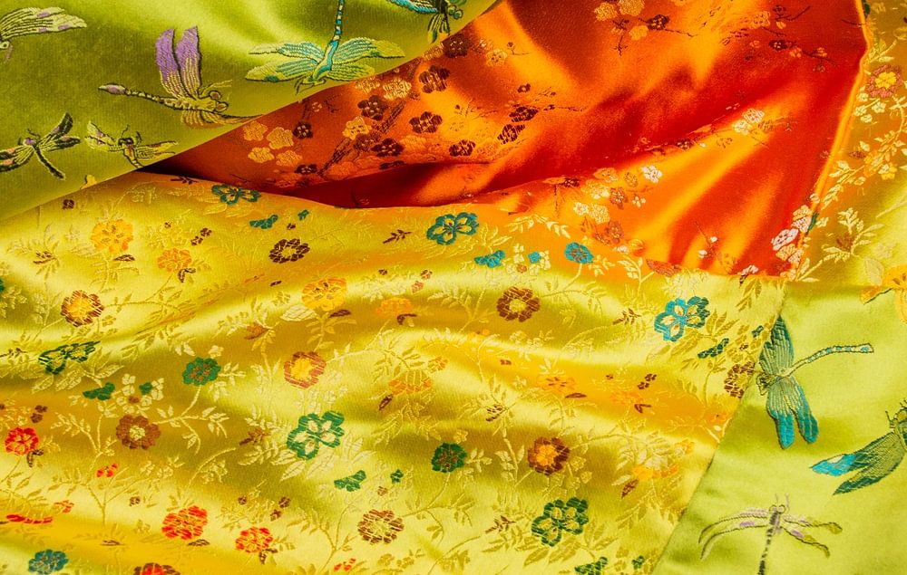 Mehrfarbiges Satintuch mit verschiedenen Bildern wie Libellen und Blumen in verschiedenen Farben wie Orange, Gelb, Rot und Blau.
