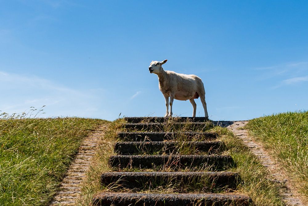 Es ist, als ob dieses Schaf die Treppe hinaufgegangen ist, um die Aussicht zu genießen. Die Aussicht von diesem Deich ist wunderschön, aber dieses Schaf genießt einfach das zarte Gras.
