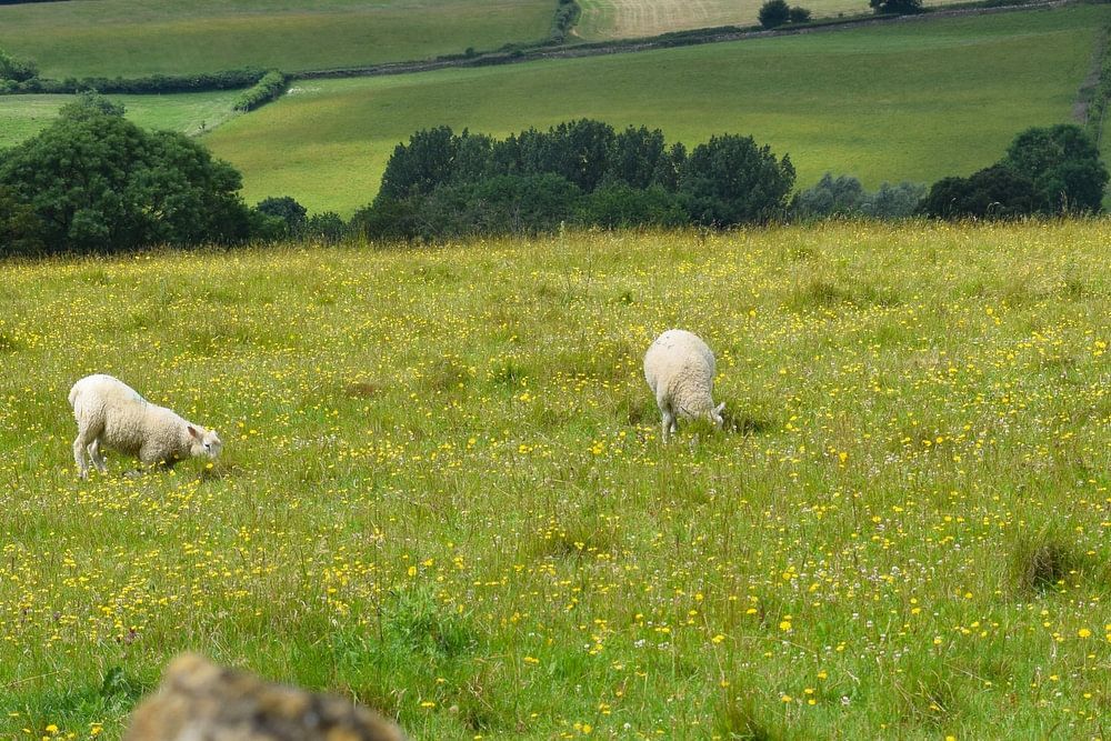 Schafe auf der Weide in einer hügeligen, englischen Landschaft mit einer Steinmauer im Vordergrund