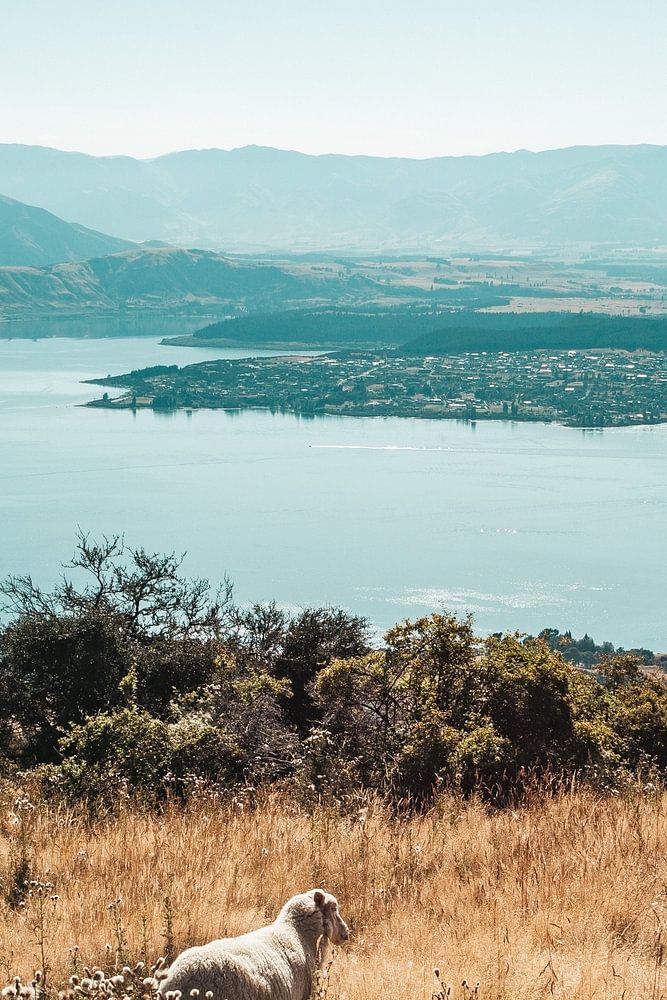 Während unserer Wanderung in Neuseeland schauten wir zurück, weil wir die Schafe vorbeiziehen sahen. So entstand dieses schöne Bild mit Blick auf den Lake Wanaka. Es war ein tropischer Tag, was zu fantastischen Farben führte! Ein warmes Bild, bei dem man sich wie im Sommer fühlt.