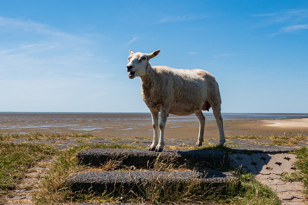 Es ist, als ob dieses Schaf die Treppe hinaufgegangen ist, um die Aussicht zu genießen. Die Aussicht von diesem Deich ist wunderschön, aber dieses Schaf genießt einfach das zarte Gras.
