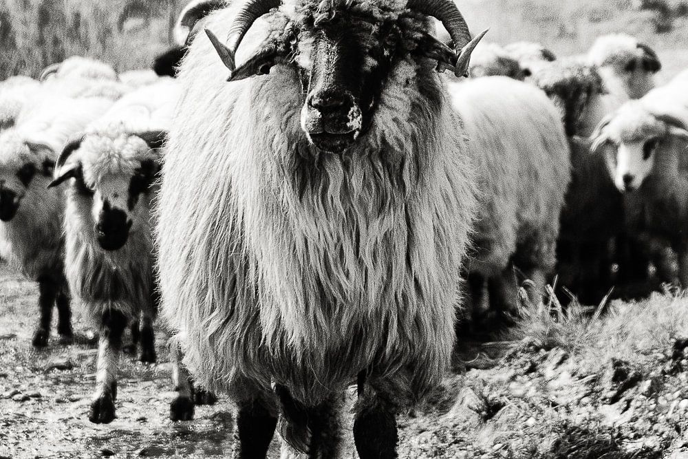 Rumänien, trafen wir auf einen Hirten und seine Schafe.