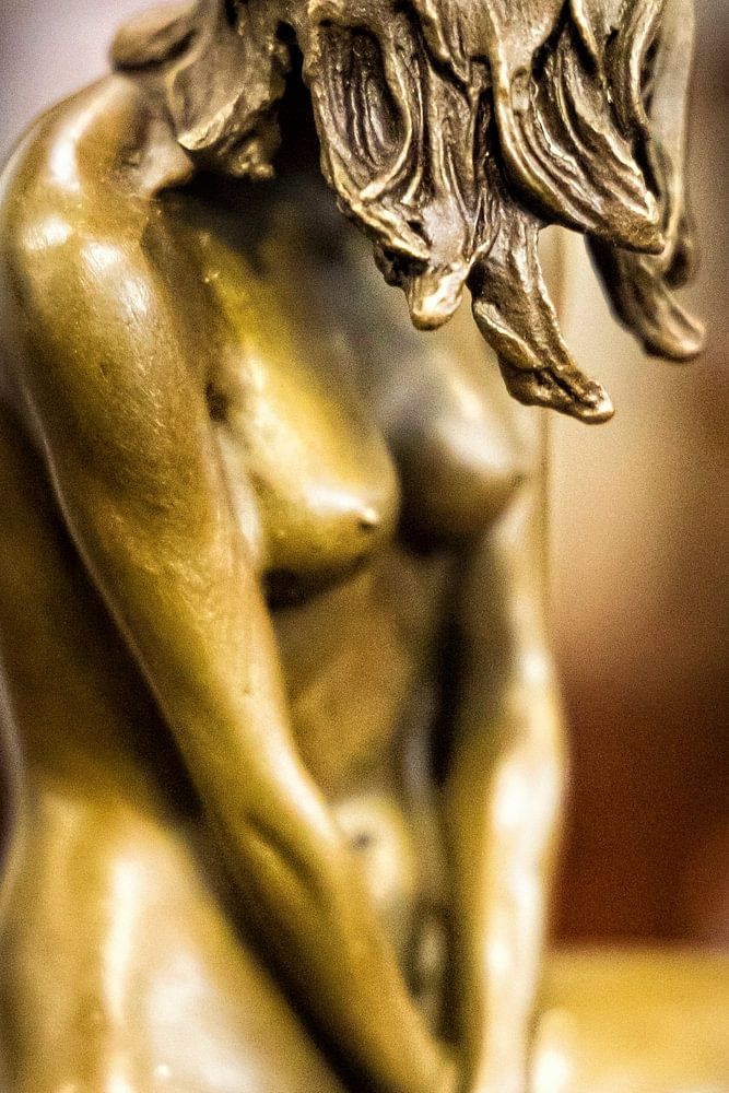 Das Bild einer alten Uhr zeigt eine Dame, deren nackte Identität hinter langen Haaren verborgen ist.