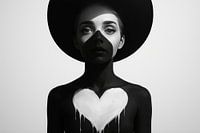 Ein eindringliches Schwarz-Weiß-Porträt mit starkem Fokus auf Form und Licht. Ein breiter Hut wirft einen scharfen dreieckigen Schatten über das Gesicht, während auf der Brust ein strahlend weißes, subtil tropfendes Herz einen Kontrast zur dunklen Körperbemalung bildet. Der schlichte Hintergrund und das grafische Spiel zwischen…