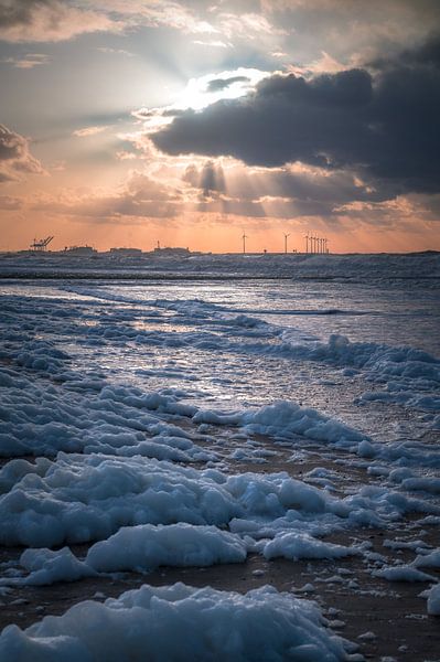 Nordsturm , Schaum auf dem Strand und die letzten Sonnenstrahlen des Tages über dem Hafen von Zeebrugge