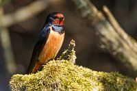 Eine Schwalbe sitzt in der Sonne auf einem Moosstumpf, der mit Moos bedeckt wird.