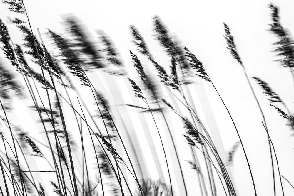 Schilf auf der Seite des Wassers, im Schnee, im Wind wehend.