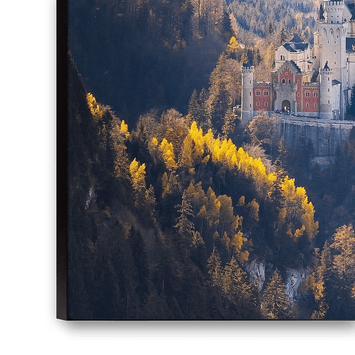Die sanften Goldtöne der Nachmittagssonne verschmelzen wunderbar mit dem Herbstlaub und heben die romantische Architektur des weltberühmten Schlosses von König Ludwig II. hervor.