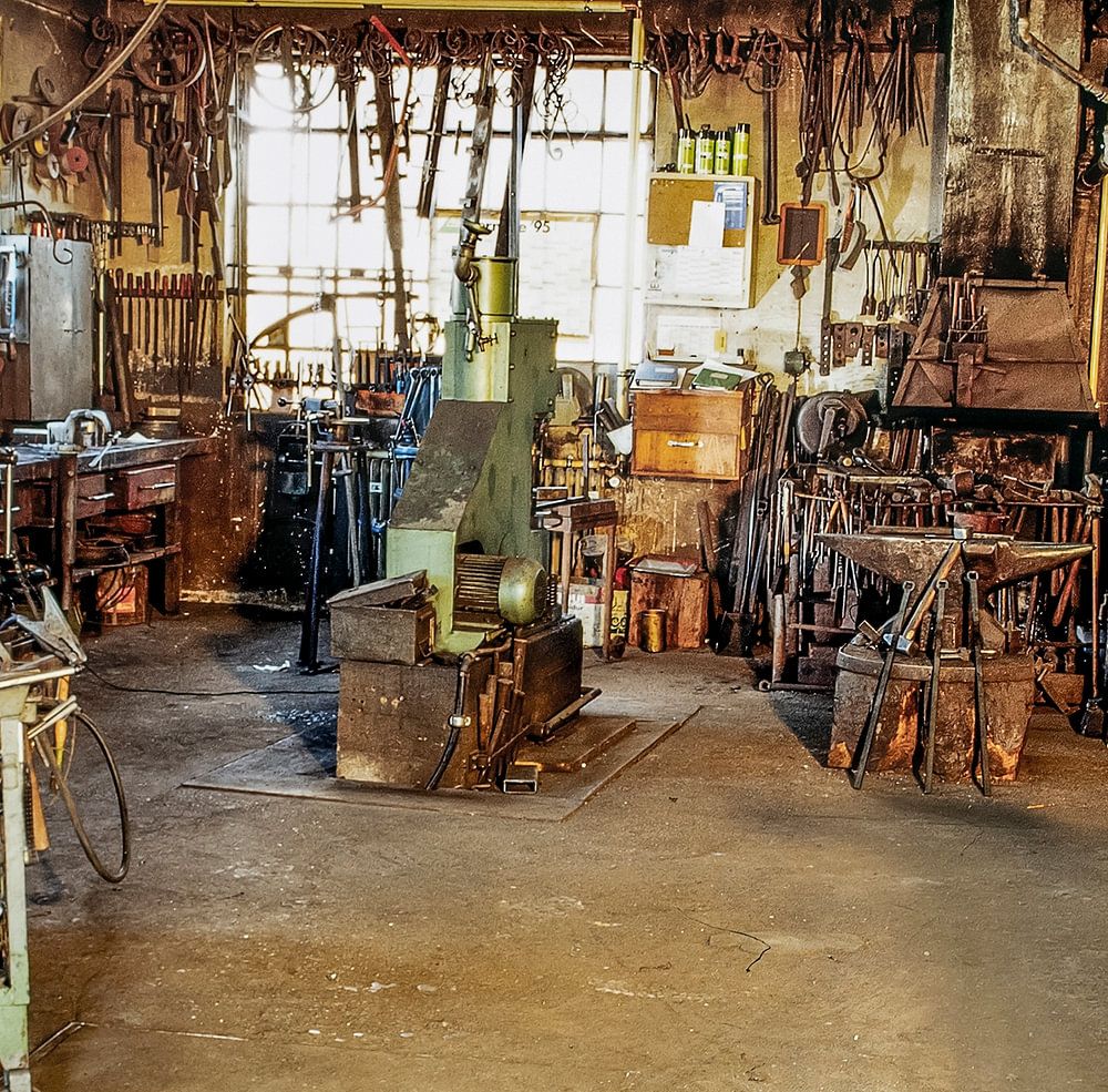 Detailaufnahme einer heruntergekommenen historischen Schmiedewerkstatt