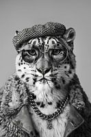 Eine anspruchsvolle Schwarz-Weiß-Porträtaufnahme eines Schneeleopard, gekleidet in einem Hut und einer Brille, zeugt von Stil und Einzigartigkeit.