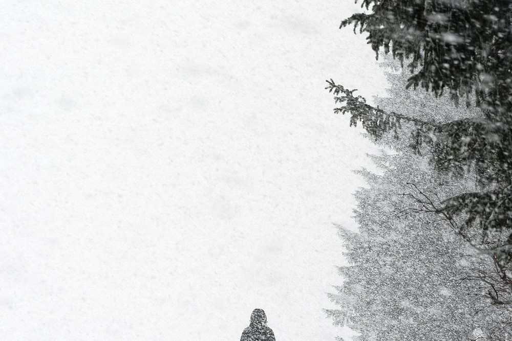 Ein heftiger Schneesturm am Rand eines Waldes, zentraler Blick auf sich entfernende Person, große und kleine Schneeflocken sind im Bild zu sehen, kontrastreiche Momentaufnahme - Location: Deutschland, Sachsen, Osterzgebirge