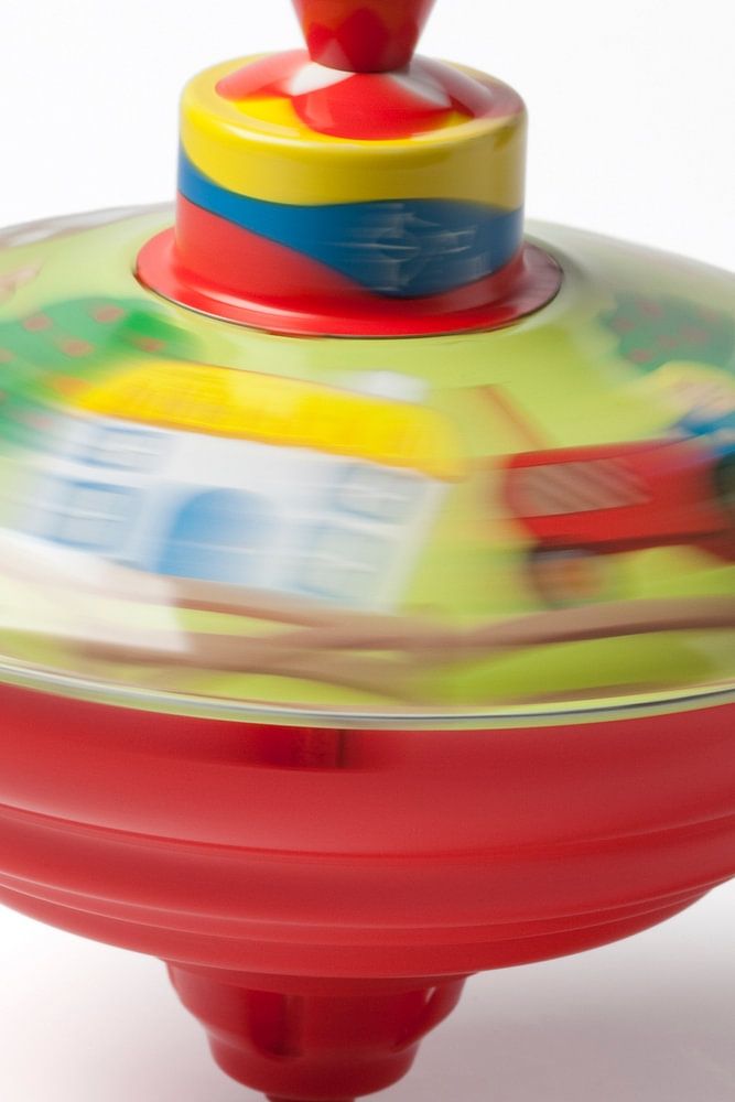 Schnellfarbiger Kreisel, der auf einer Spitze sitzt und durch Kreiselwirkung aufrecht bleibt