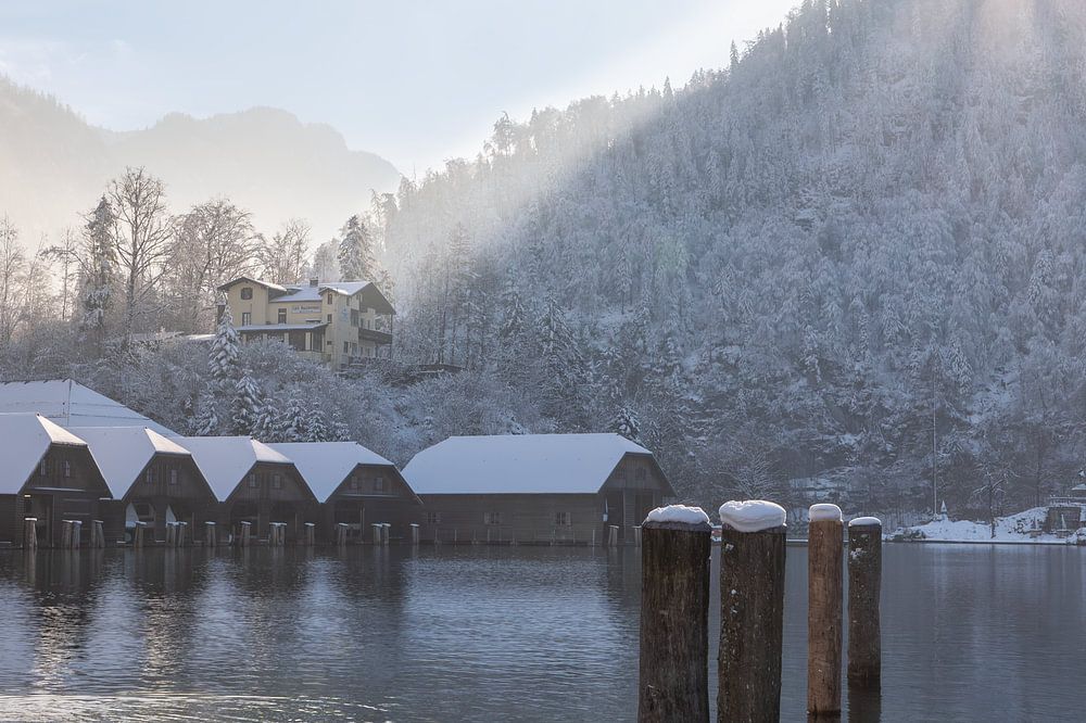 Het mooie zachte licht van de middag zon schijnt prachtig over de bergen door de mist en de laaghangende wolken, waardoor prachtige zonnestralen ontstaan. Het is een fraaie foto vanaf de kade bij Schönau. De besneeuwde boothuizen geven het werk een fraaie wintersfeer. Schönau is een toeristisch dorp in het Berchtesgadener land. Het dorp ligt vlakbij de Oostenrijkse grens. De mist over het water en de laaghangende wolken zorgen ook voor een mysterieuze sfeer in het werk. Het landschap reflecteer mooi over het water. In dit prachtige landschapsfotografiekunstwerk zie je de stilte en schoonheid van de natuur met zijn prachtige kleuren en vormen. Met dit mooie landschapskunstwerk als wanddecoratie haal je de stilte en schoonheid van de natuur in huis. Dit fotografiekunstwerk is een prachtige wanddecoratie voor je lege plek aan de muur te vullen, waar je elke dag weer opnieuw van kunt genieten. Deze foto is in liggend (landschap) formaat en past bij vele woonstijlen en interieurs en vooral bij mensen die van de natuur houden. Dit kunstwerk “Schönau am Köningssee“ wordt je aangeboden door John van de Gazelle fotografie op Werk aan de Muur. John van de Gazelle fotografie zie de stilte en schoonheid van de natuur“