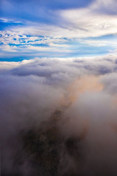 Schöne Wolken unter dem Strudel, rosa und orange von der untergehenden Sonne beleuchtet, oben am blauen Himmel. Luftbild