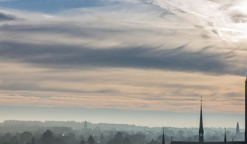 Das Foto wurde an einem kalten Winternachmittag aufgenommen. Die Sonne beginnt unterzugehen und gibt einen schönen Schein über Hilversum mit Blick auf die St.-Veits-Kirche, die sich mit einer schönen Silhouette von den aufgefächerten Wolken abhebt.