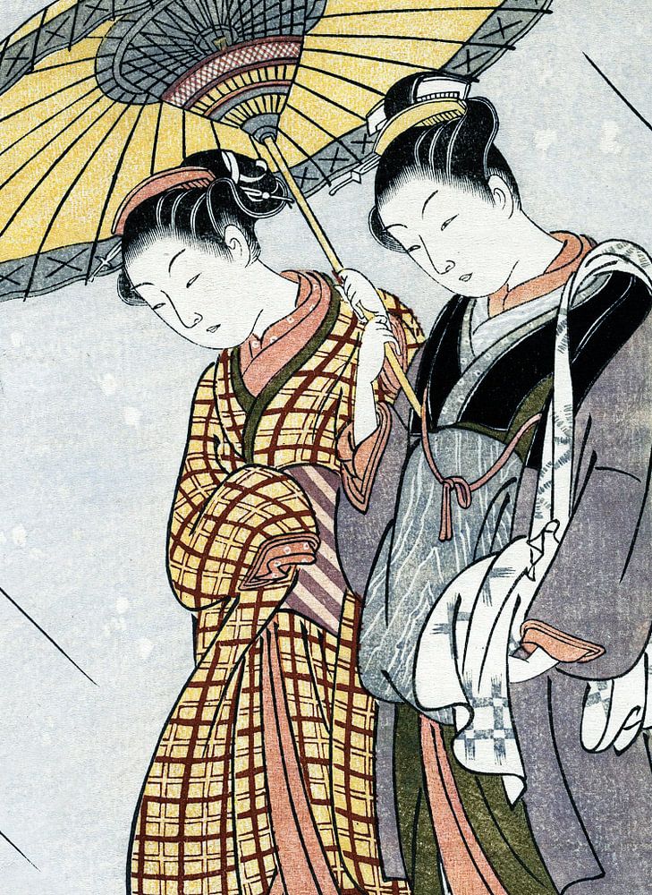 Suzuki Harunobu war ein japanischer Designer des Holzschnitts im Ukiyo-e-Stil. Er war ein Innovator, der 1765 als erster Vollfarbdrucke (nishiki-e) herstellte und damit die früheren Modi des Zwei- und Dreifarbdrucks überflüssig machte. Harunobu verwendete viele spezielle Techniken und malte eine Vielzahl von Themen, von klassischen Gedichten bis hin zu zeitgenössischen Schönheiten. Wie viele Künstler seiner Zeit schuf auch Harunobu eine Reihe von Shunga- oder erotischen Bildern. Während seines Lebens und kurz danach ahmten viele Künstler seinen Stil nach. Einige, wie Harushige, prahlten sogar mit ihrer Fähigkeit, das Werk des großen Meisters zu schmieden. Über das Leben von Harunobu ist viel unbekannt.