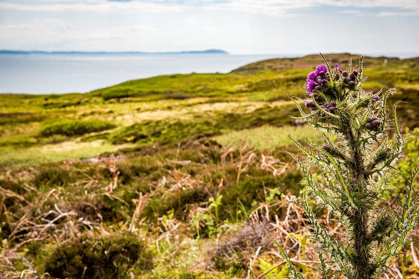 Bestelle dieses Landschafts-Wandbild Schottische Distel am Meer von Patrick Kilb als Kunstdruck auf Leinwand, Alu-Dibond, als Poster, Fototapete oder Acrylglasbild.